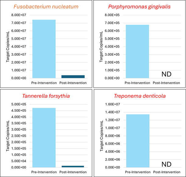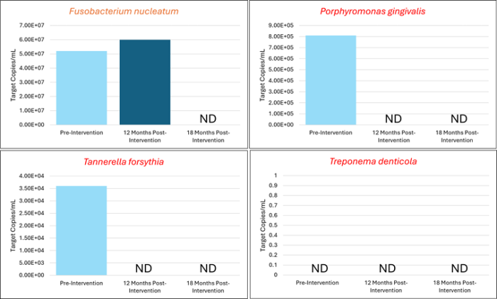 Figure 1. Salivary diagnostic testing data before and after the Test, Treat, Repopulate Protocol. ND means that the oral pathogen was no longer detected following implementation of the protocol across all 15 patients.